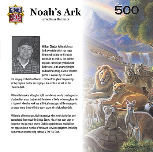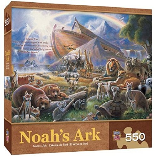 This MasterPieces 24 inch x 18 inch 550 piece Noah's Ark Inspirational Puzzle was masterfully painted by William Clayton Hallmark. Hallmark's inspirational bible verses and insightful paintings convey faith, and are a reflection of God's redeeming love. "Whenever the rainbow appears in the clouds, I will see it and remember the everlasting promise between God and all living creatures of every kind on the earth." - Genesis 9:16. This painting features several pairs of lifelike animals grazing in the grass, with a giant arc, a bright sun, and a colorful rainbow in the background. To reduce its impact on our environment, the chipboard used in this puzzle is made of recycled material. This puzzle was proudly made in the USA, on premium, extra-thick blue board, for an even better puzzling experience.Noah's Ark with animals puzzle