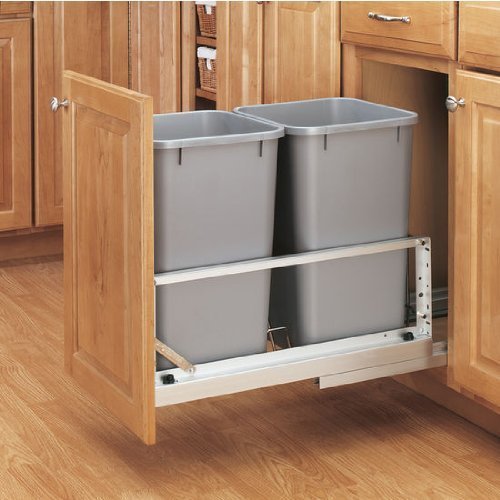 Rev-a-Shelf-Double 27 Qt. Soft-Close Trash Can Unit - This popular unit provides a smooth gliding, extremely stable system with built in door mounting capability. Sleekly styled with heavy-duty brushed aluminum soft-closing slides. Easy bottom mount installation. Features: Two 27 Qt Silver Polymer Containers with Full-Extension, Heavy Duty, Aluminum Drawer Slides and Built-In Door Mounting System with Ramp-In Self-Closing. Width 11-11/16" Depth 22-1/4" Height 18-15/16"Rev-A-Shelf - 5349-1527DM-217 - Double 27 Qt. Pull-Out Brushed Aluminum and Silver Waste Container